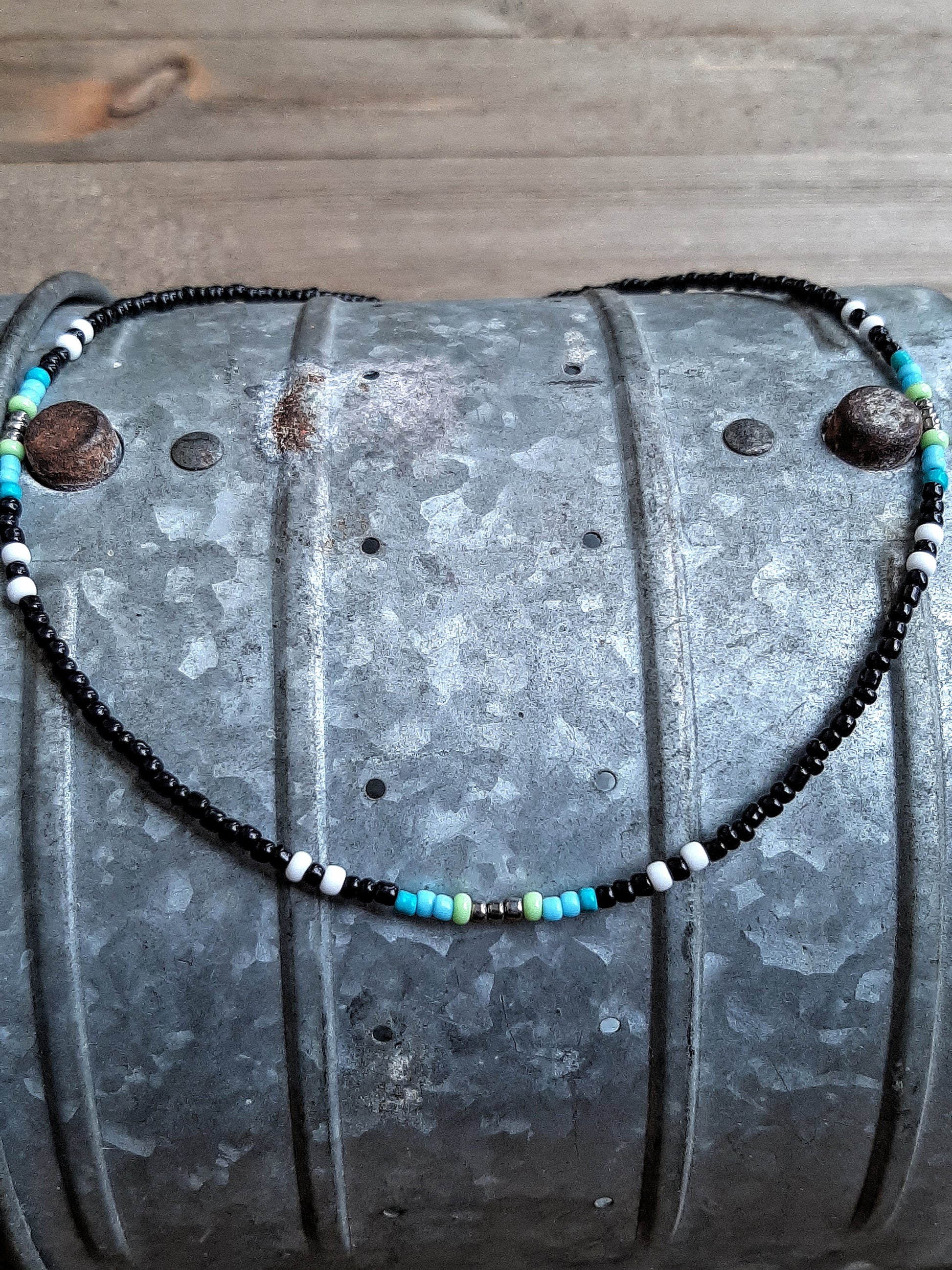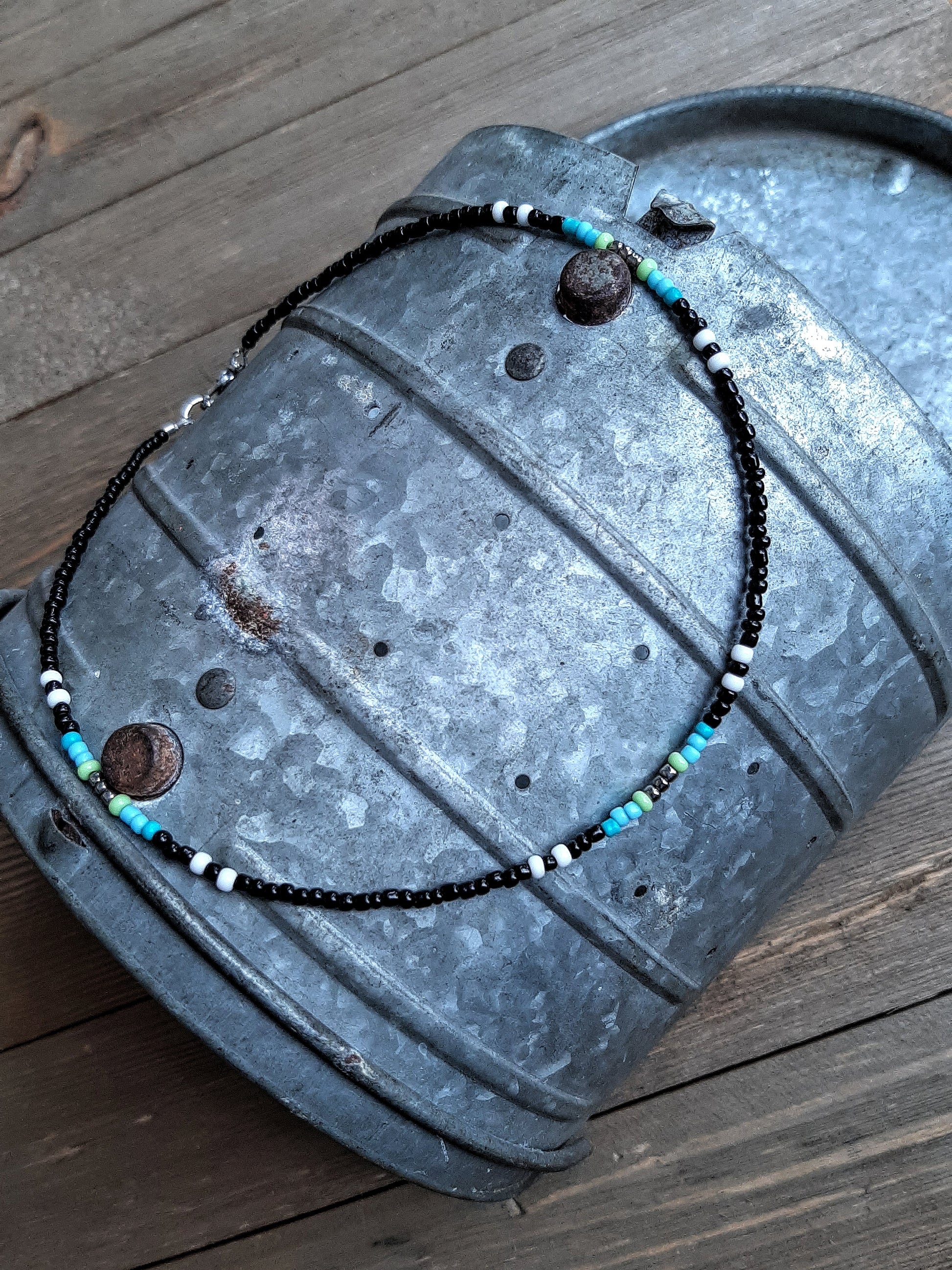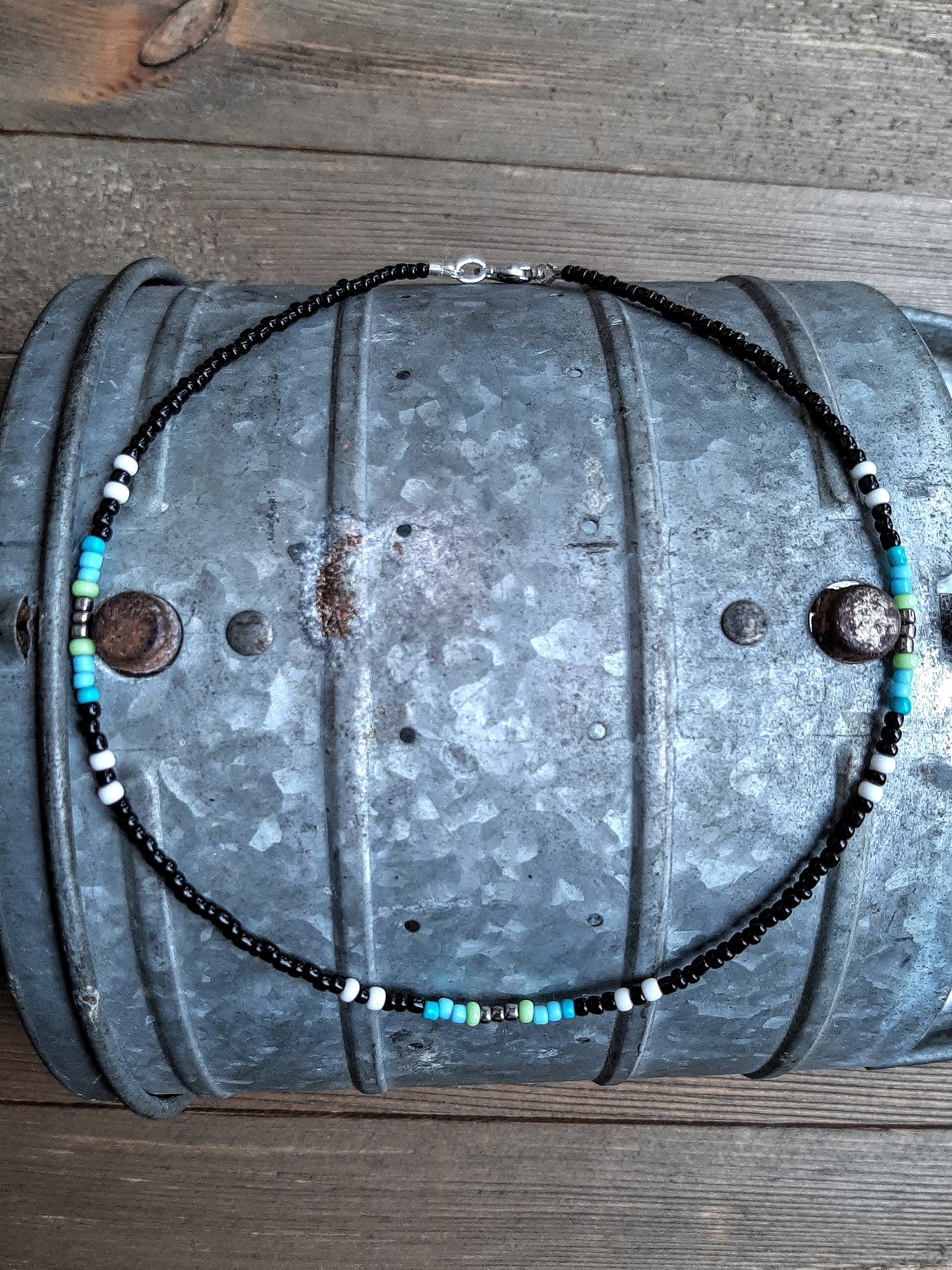 Silver, Blue, Green, Black & White Glass Seed Beads & Stainless Steel Hardware