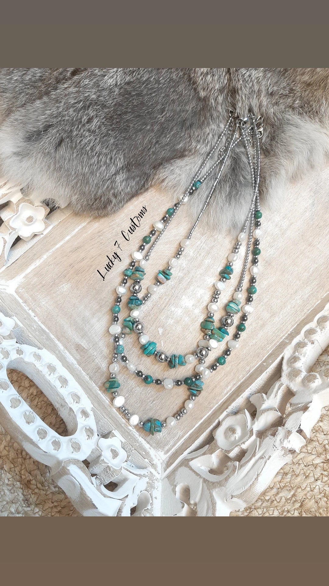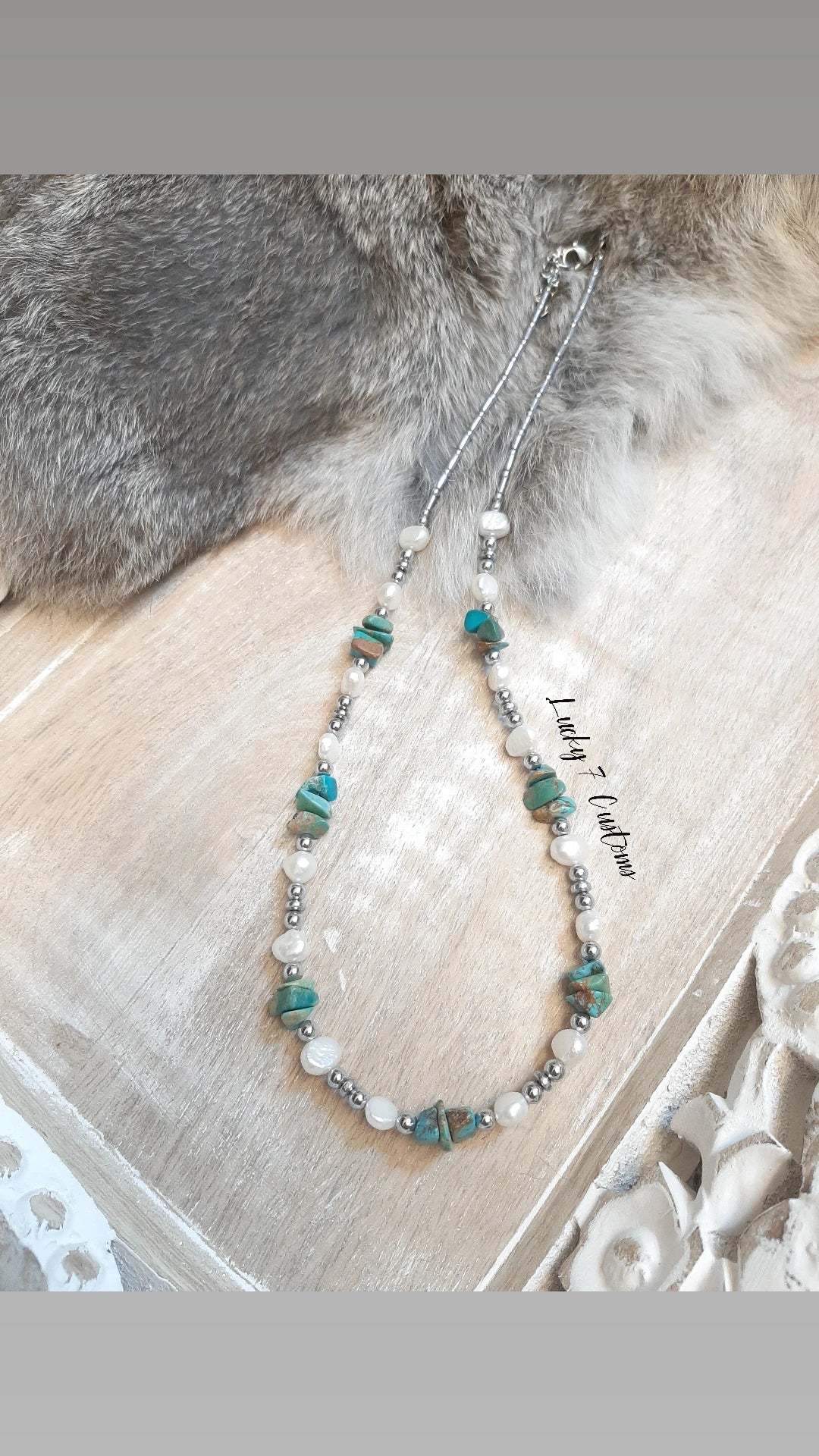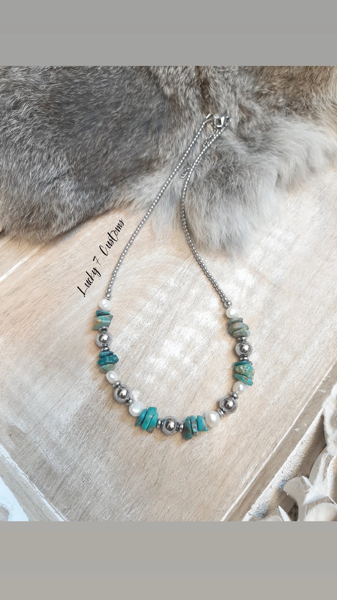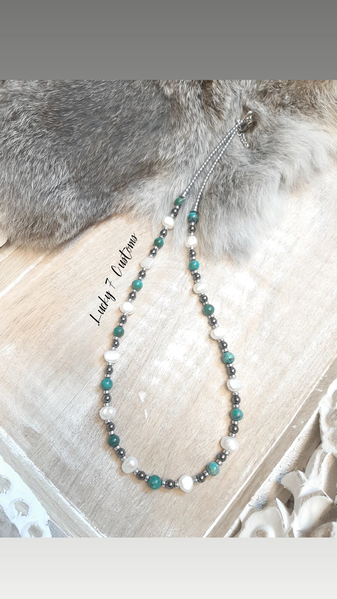 Genuine Turquoise, Freshwater Potato Pearls, Silver Hematite & Stainless Steel Hardware