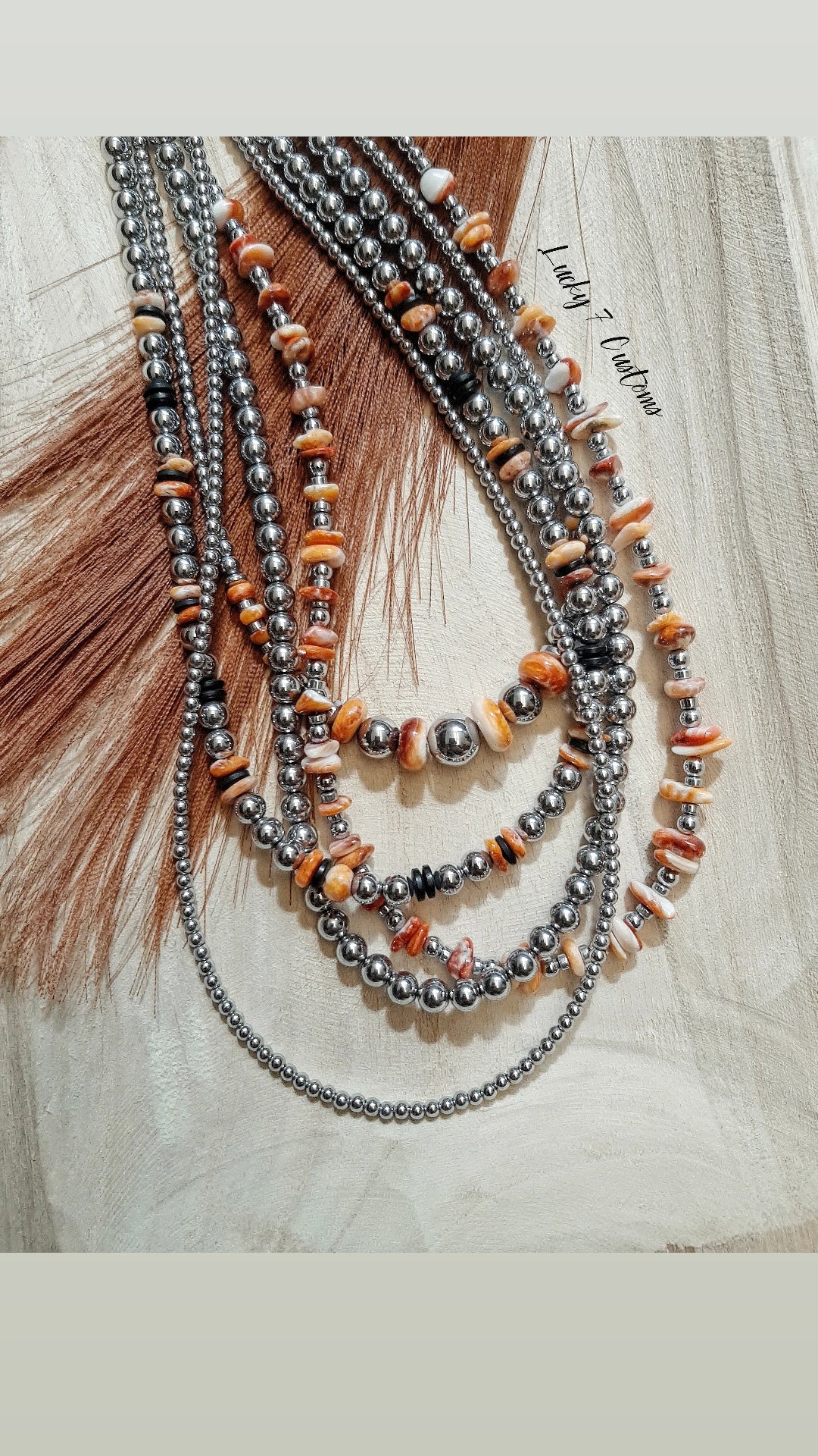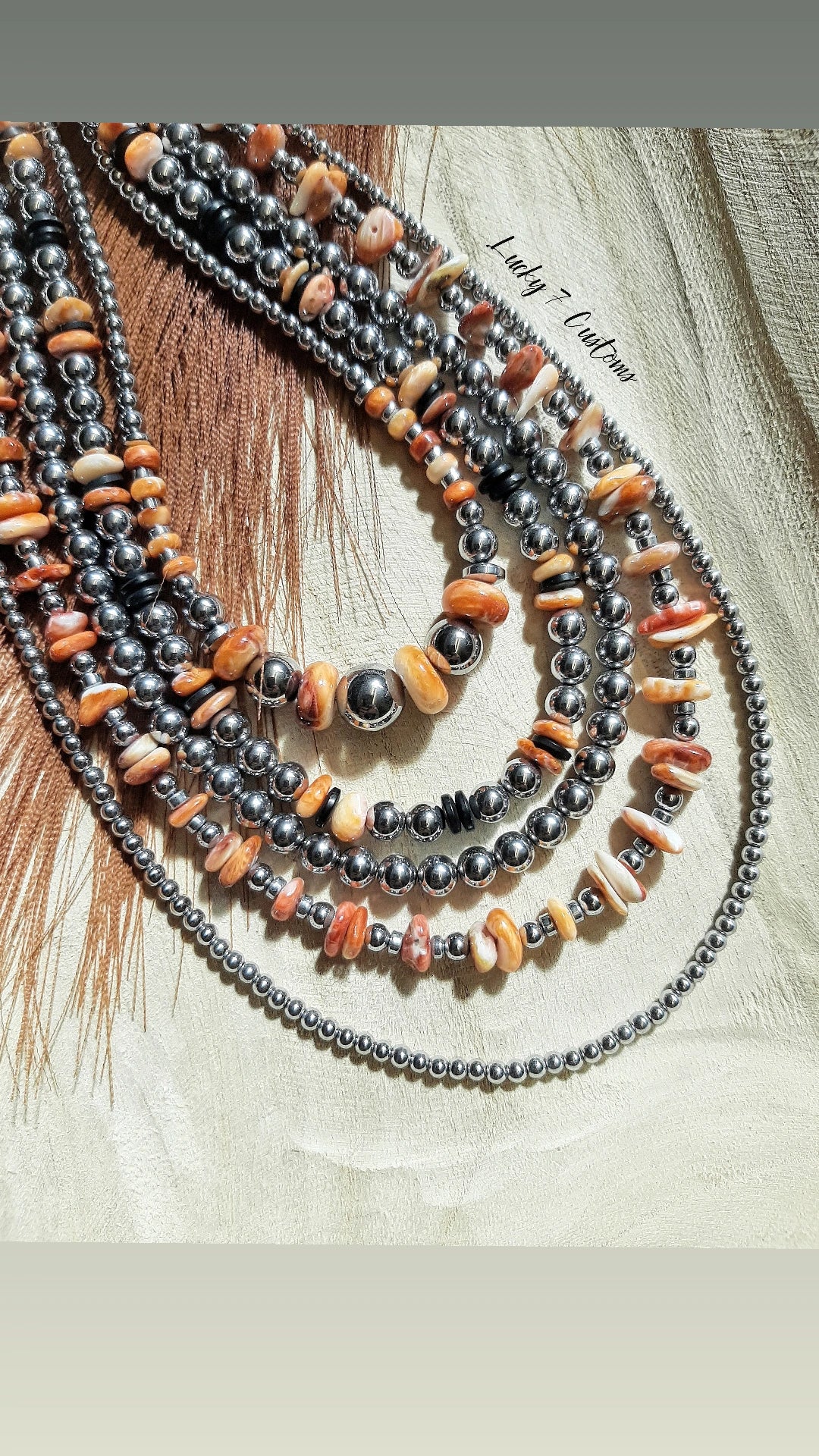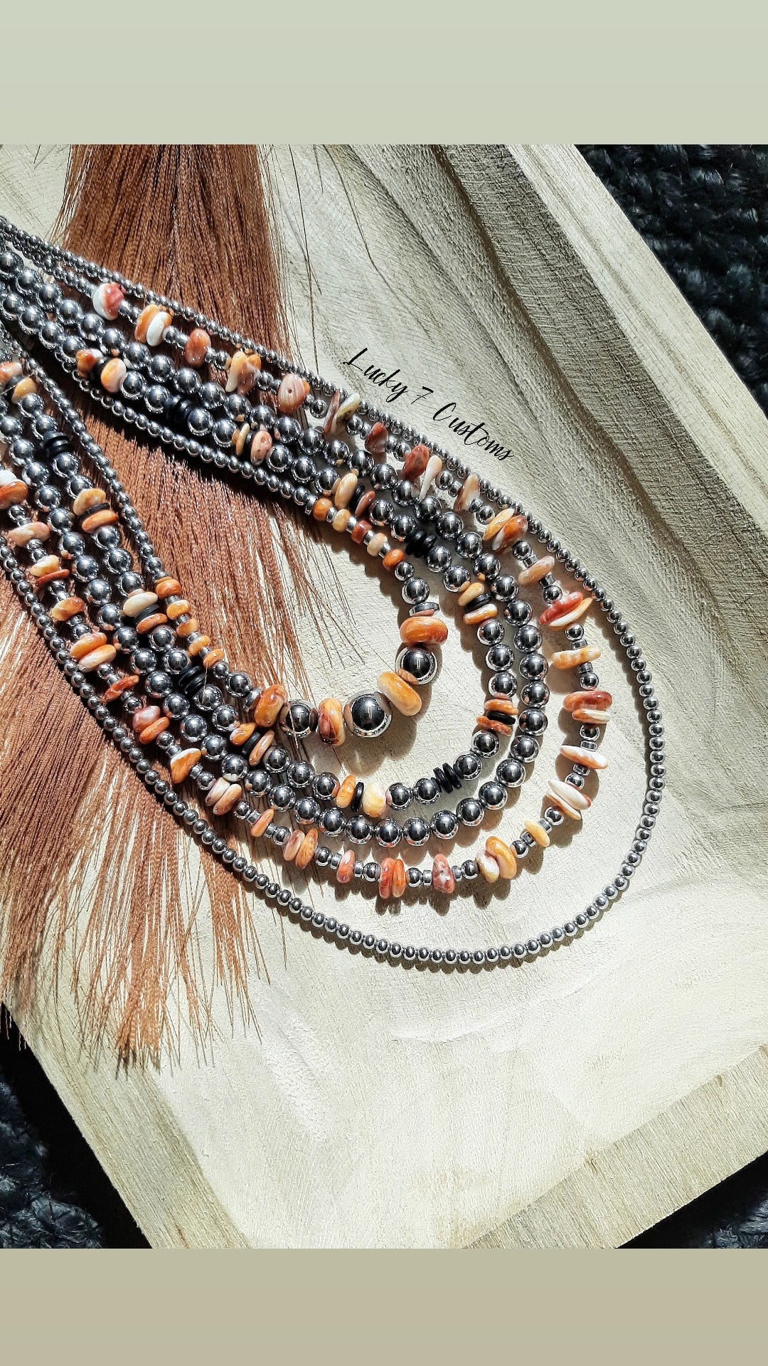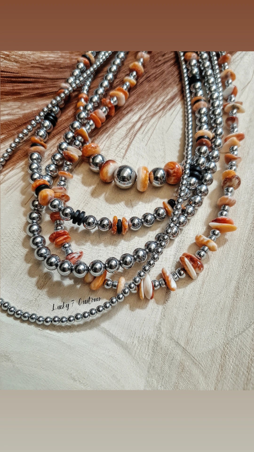 Orange Spiny Oyster, Black Amber, Silver Hematite & Stainless Steel Hardware