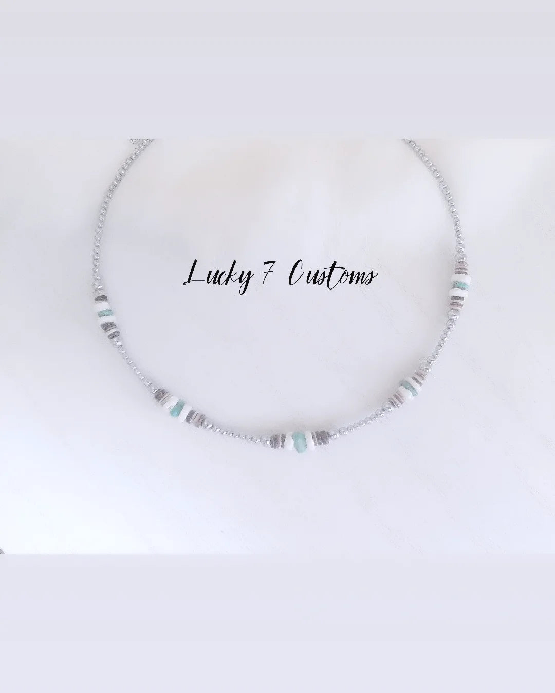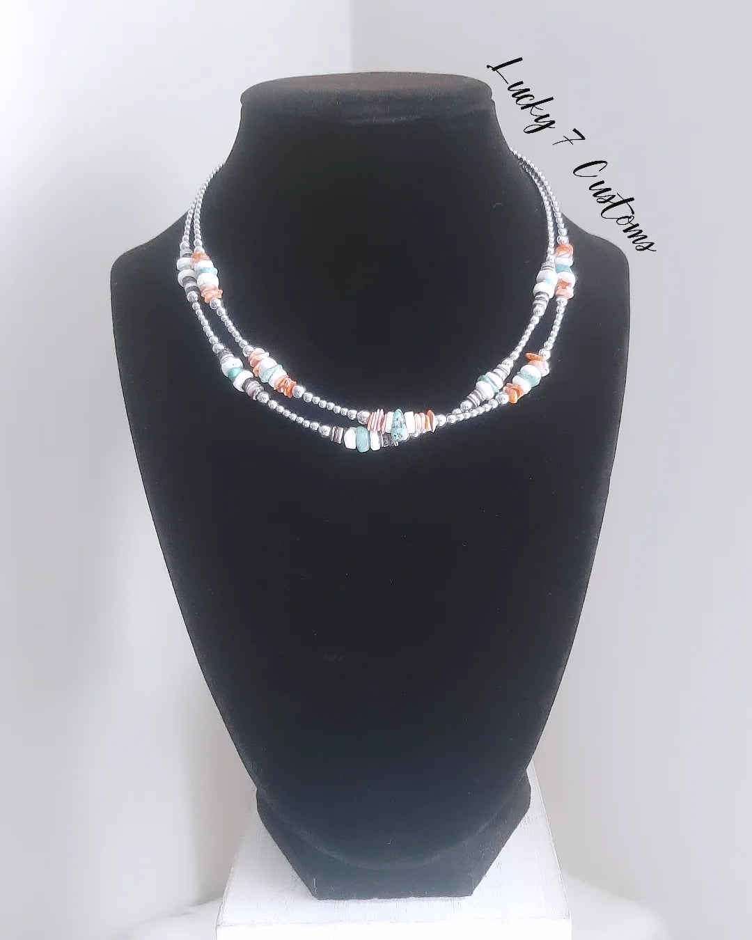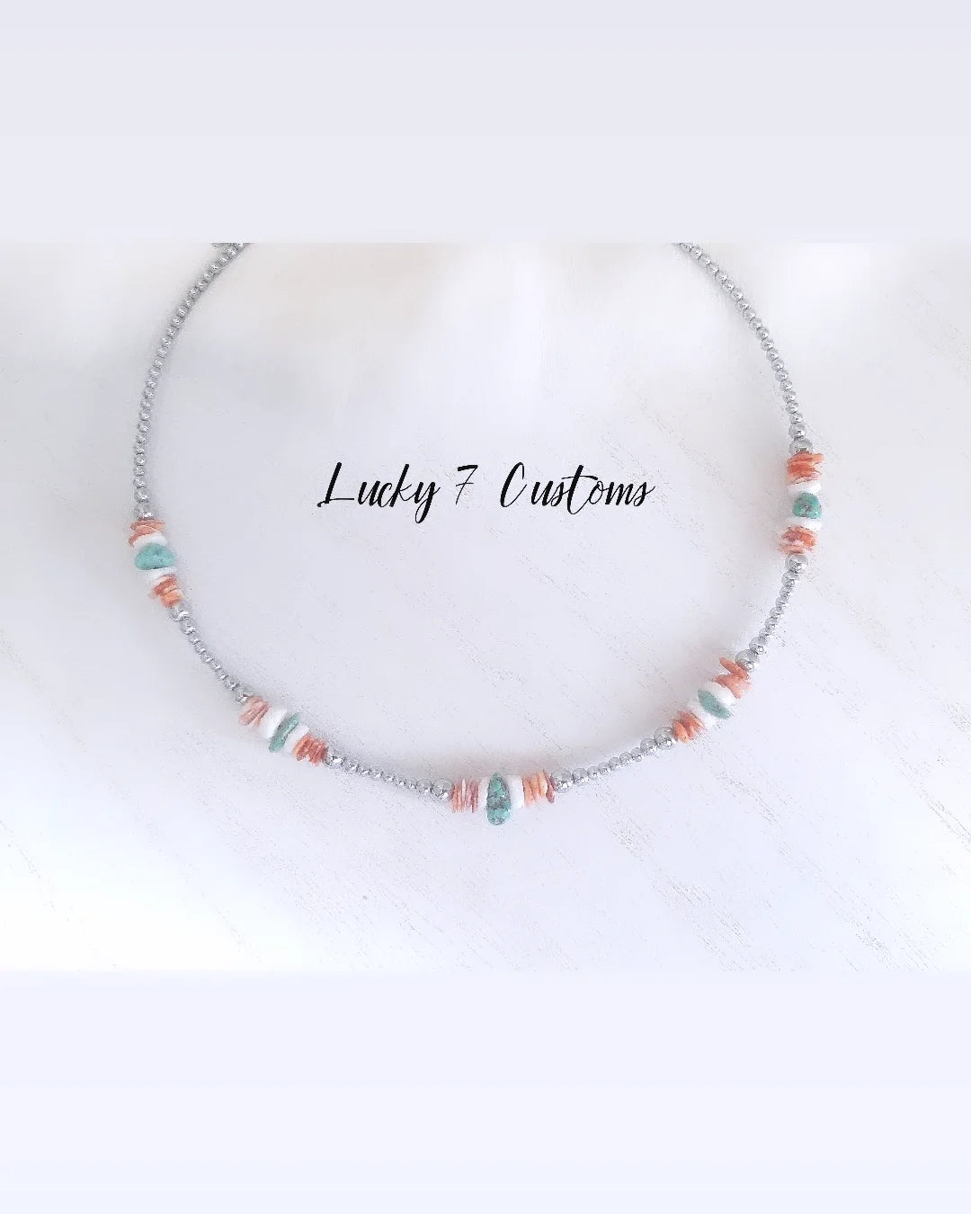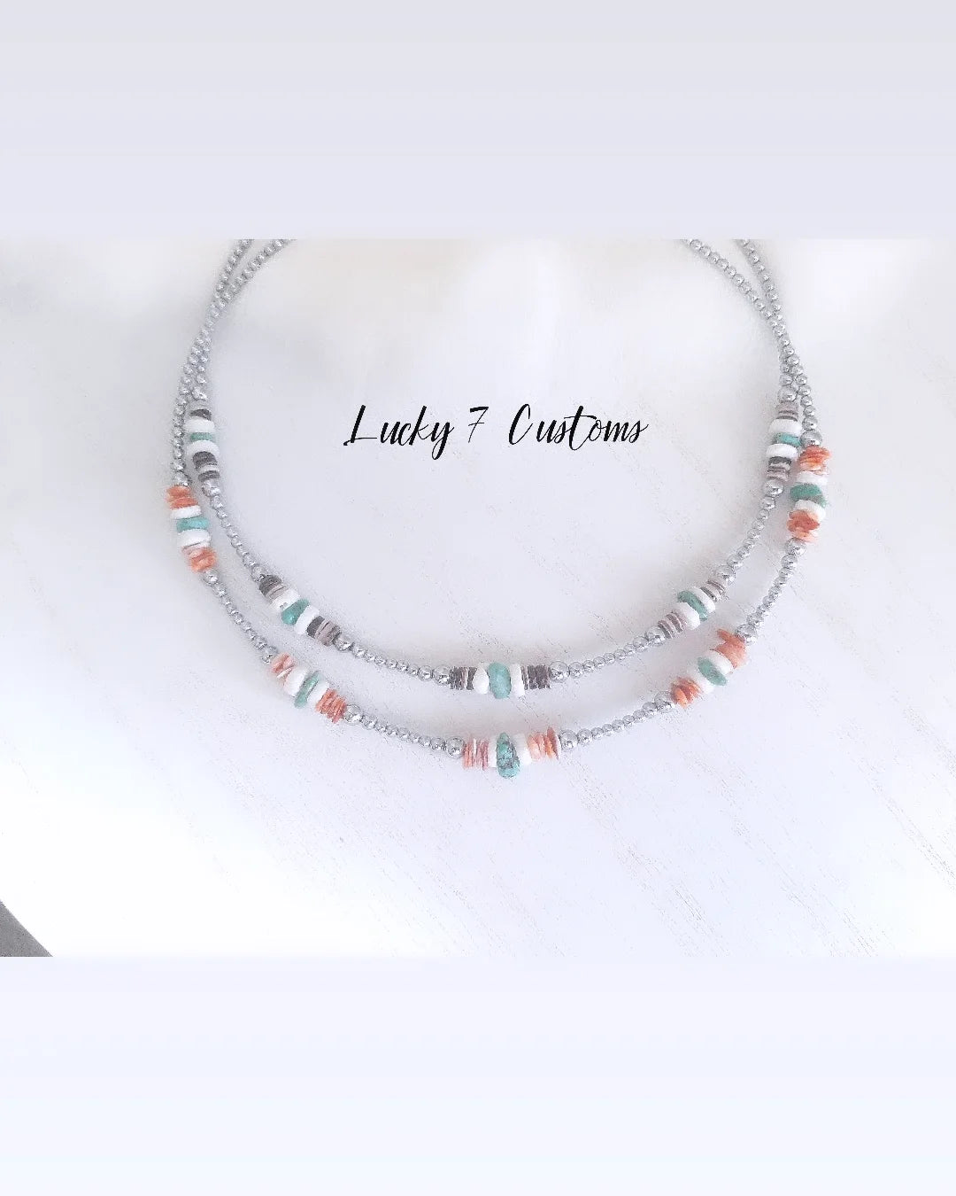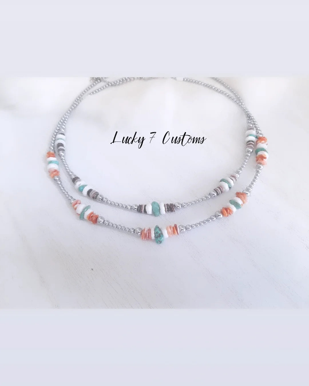 Genuine Turquoise, White Shell, Purple Lahuanus Shell, Orange Spiny Oyster, Silver Hematite & Stainless Steel Hardware