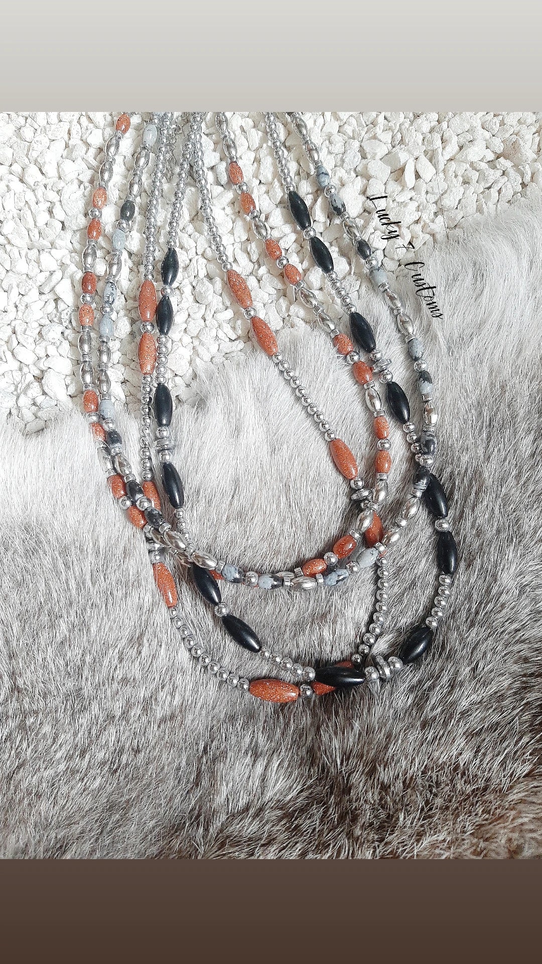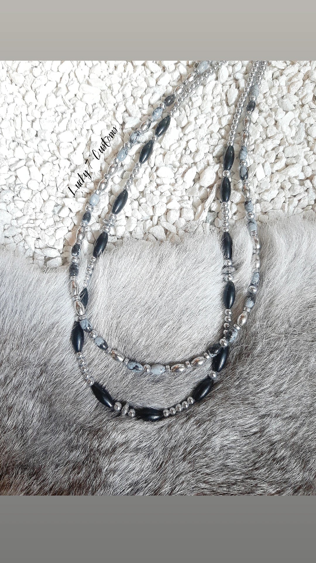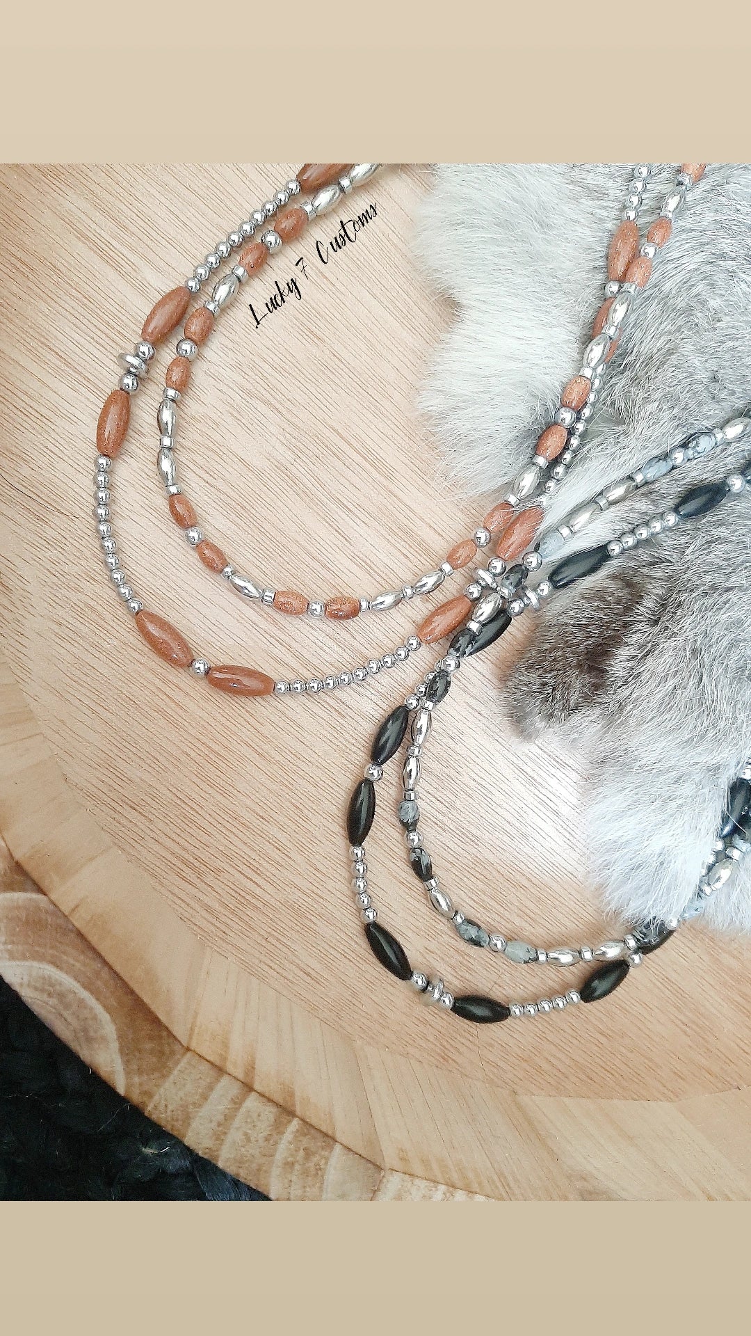 Snowflake Obsidian, Black Onyx, Goldstone, Silver Hematite & Stainless Steel Hardware